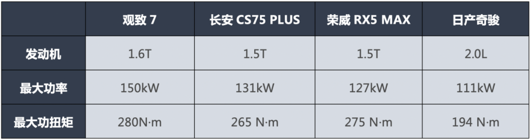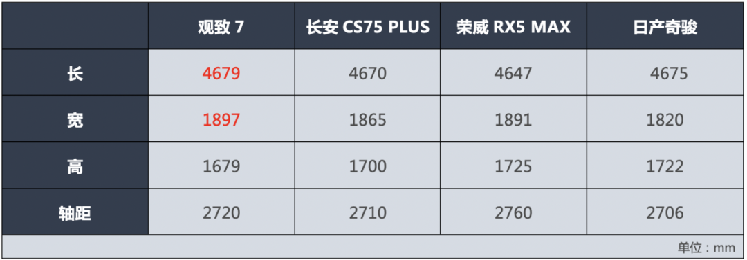 在紧凑型SUV市场,观致7是一名后来者,在它前面有着长安CS75 PLUS、荣威RX5 MAX、日产奇骏等强劲对手。如何在紧凑型SUV市场脱颖而出,观致7首先在空间尺寸上下功夫。