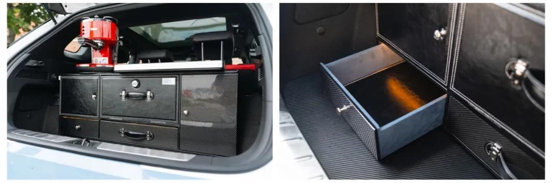 从造型和内饰设计来看,虽然ICON BOY很狂野,粗犷,但是也有不少贴心设计来满足用户对精致生活的追求,提供后备箱储物柜皮质版、后备箱储物柜木质板、后备箱储物柜碳纤版给消费者选择。其中,后备箱储物柜木质板的表面采用皮质和木材组成,而后备箱储物柜碳纤版的表面则是使用了皮质和碳纤维材料,并且储物柜内部配有灯光,高贵、优雅。