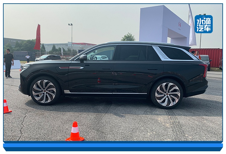 车身侧面同样可以看到中国经典美学中的“气韵生动”表现手法,翼子板处飘扬的红旗标志表明自己的身份。红旗E-HS9 C柱的银色饰板上带有显示电池电量的灯组,设计十分新颖。车身长宽高分别达到了5209/2010/1731mm,轴距为3110mm,整车尺寸超过大型行政车型,符合红旗旗舰级定位。