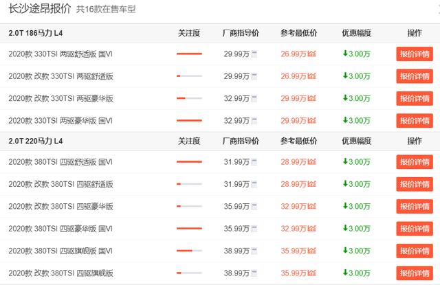 近日,我们从长沙地区经销商处了解到,上汽大众途昂 (配置|询价)目前终端现金优惠3万元,而且全系车型均满足此优惠条件。