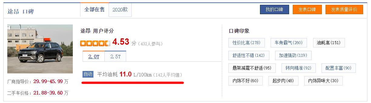 至于动力,途昂搭载代号EA888的2.0T高低功率发动机和2.5T发动机,其最大功率分别为186马力、220马力、299马力,传动则是匹配的7速双离合变速箱。油耗上,三个版本的官方百公里油耗为7.7L、8.6L、9.9L/100km,实际测得的车主平均油耗为11L/100km(2.0T)、13.3L/100km(2.5T)。