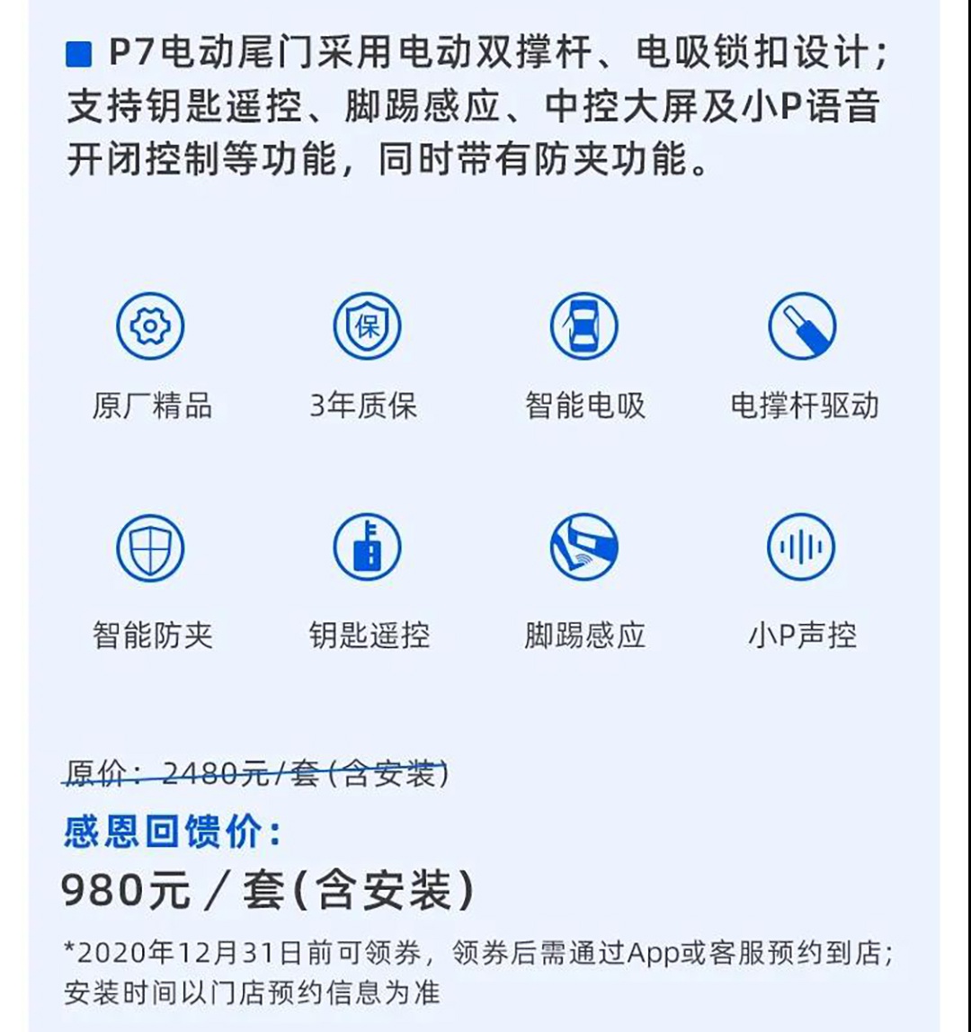 日前,小鹏汽车官方宣布,小鹏P7 (配置|询价)电动尾门正式上市,其官方售价为2480元/套,且包含安装费用。另外,在今年12月31日前,小鹏P7大定用户和小鹏P7车主可在官方领取1500元电动尾门代金券,优惠后仅为980元/套,同样包含安装费用。