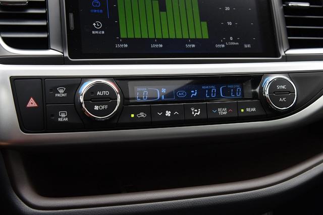 空调为三温区设计,旋钮与按键操作搭配更为直观,且旋钮阻尼手感也很好,并加入了丰田TSS智行安全系统。