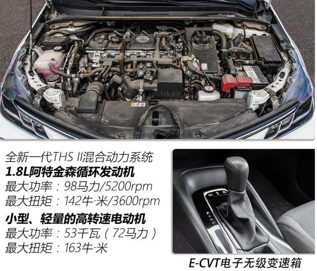 在混合动力领域,如果丰田称二哥绝对没有人敢称大哥,而卡罗拉上搭载的这套动力总成绝对是混动界的明星机型,这款动力总成采用了1.8L阿特金森发动机以及小型轻量化高速电机组成,其中发动机最大马力98匹最大扭矩142牛米。电机最大功率72匹,最大扭矩163牛米。这套动力总成燃油经济性独一无二,热效率相当高,多数车主的油耗都在5L以内,表现相当出色。在国内这套动力总成保有量大,而且故障率低,这也是它的优势所在。
