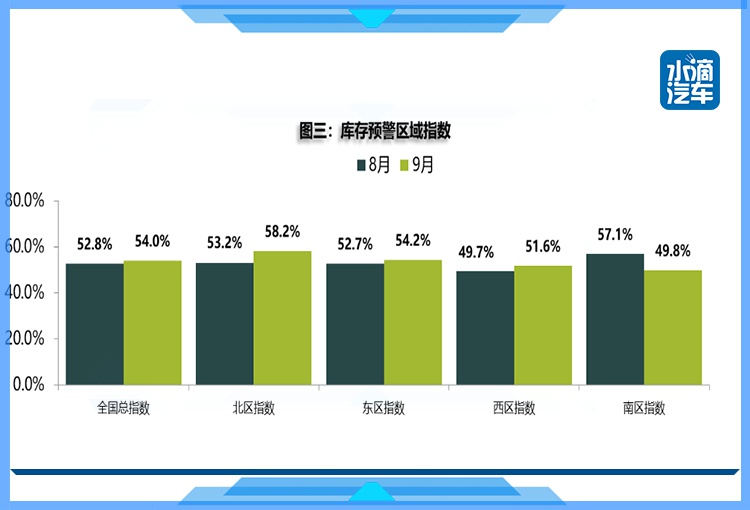 从区域指数情况来看,流通协会的调查显示,9月份全国总指数为54.0%,北区指数为58.2%,东区指数为54.2%,西区指数为51.6%,南区指数为49.8%。临近四季度,经销商进入秋季补库周期,而南方地区的广东、湖南、湖北等省份销量增速较快,库存压力略有缓和。