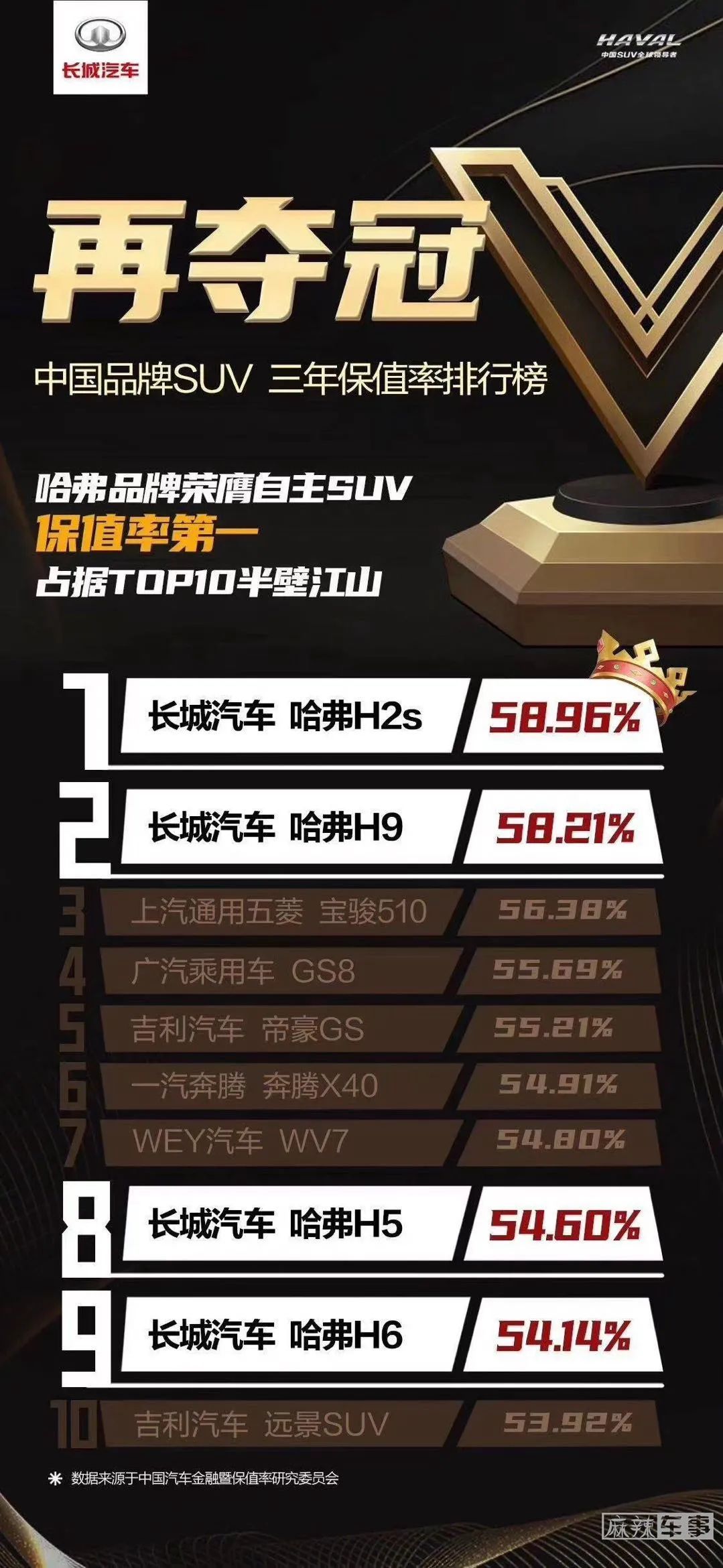 我们从中国汽车金融暨保值率研究委员会公布的中国品牌SUV三年保值率前十榜单来看,长城汽车旗下的哈弗H2s、哈弗H9 (配置|询价)、哈弗H5 (配置|询价)、哈弗H6四款车型上榜,可以说占据了这份榜单的半壁江山。