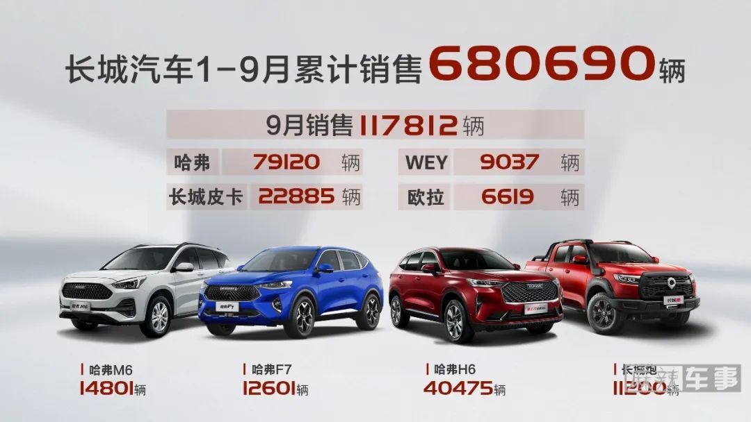 不仅如此,在刚刚过去的9月,长城汽车销量117,812辆,环比大涨32%,同比大涨18%。其中,海外销售7,773辆,同比大幅增长46%,环比增长14%。哈弗、欧拉、长城皮卡及WEY品牌均实现同比、环比双增长。1-9月,长城汽车累计销售680,690辆,结合当前市场环境来看,这个成绩实属难得。