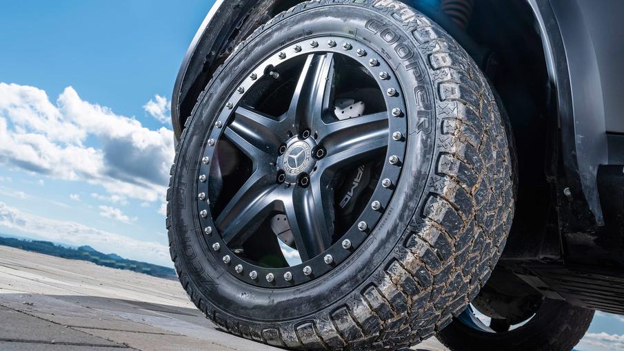 除此以外,工程师们还为车辆的空气悬架选择了更严格的设置,更换了更耐磨的越野轮胎,以及20英寸的铆钉轮辋,以保证这台纯电越野车在松软的地面上具备更强的牵引力。