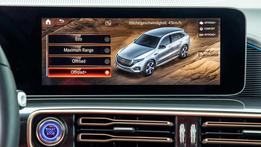 与底盘相比,该车的动力总成没有做任何改变。EQC 4×4²的前后轴分别装有功率和扭矩分别为140kW和380Nm的两个电机,地板上装有80kWh的电池。