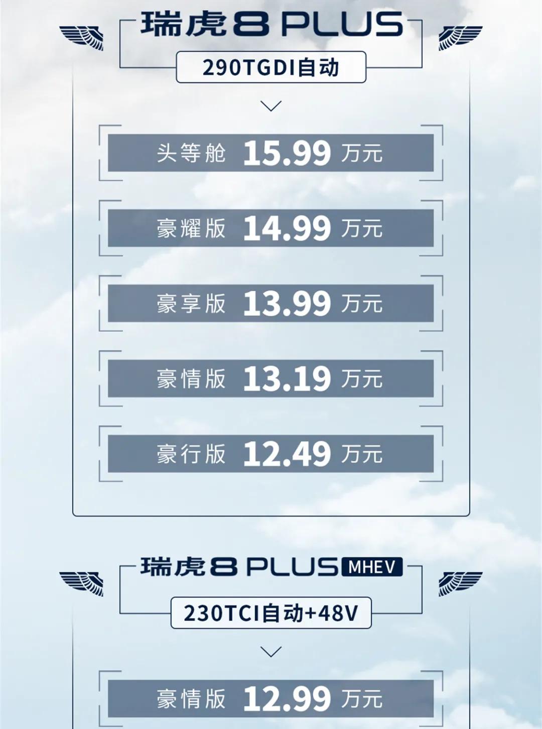 动力部分,此次瑞虎8 PLUS有5款车型搭载了1.6T+7DCT的动力总成,其中1.6T发动机最大功率为197马力,最大扭矩290N·m,参数与瑞虎8的1.6T车型保持一致。另外,新车还推出了一款搭载1.5T+48V轻混系统的车型,其中发动机最大功率为156马力。