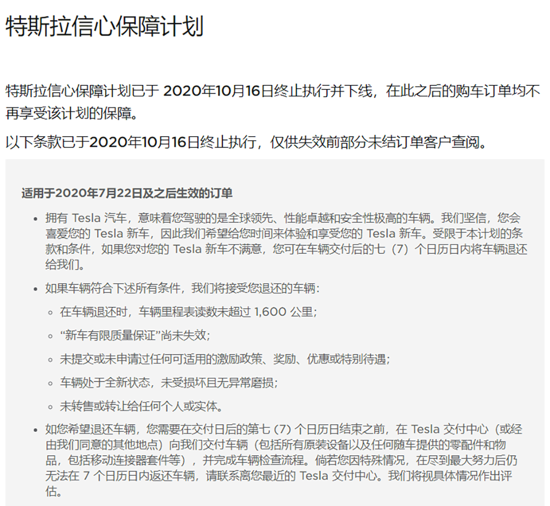 此前,按照特斯拉实施的“信心保障计划”,如果购车后对新车不满意,可在车辆交付后的七天内,若车辆里程表读数未超过1600公里,“新车有限质量保证”尚未失效,未提交或未申请过任何可适用的激励政策、奖励、优惠或特别待遇,车辆处于全新状态,未受损坏且无异常磨损以及未转售或转让给任何个人或实体,可将车辆退还给特斯拉,特斯拉将在30个工作日内退还除1000元定金外的所有车款。但同时,在退车后的12个月内无法再次购买与所退车型相同版本的特斯拉车型。