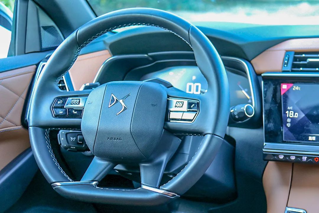 DS 7的方向盘采用四辐平底式设计,以及真皮材质包覆,握感较为出众。此外,DS 7方向盘上的按键还采用了玑镂雕刻巴黎饰钉工艺,使车内的法式豪华气息更加突出。