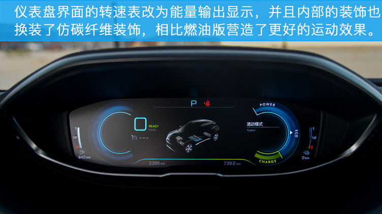 内饰部分,标致4008 PHEV同样是采用了家族式的“i-Cockpit”座舱,但为了体现混动以及高性能的身份对细节处进行了调整,仪表盘界面的转速表改为能量输出显示,并且内部的装饰也换装了仿碳纤维装饰,相比燃油版车型营造了更好的运动效果。除此之外,4008 PHEV还提供了全新的驾驶模式,四种驾驶模式分别为混动、纯电、运动以及四驱,可以更好的适应路况并自动切换工作状态。