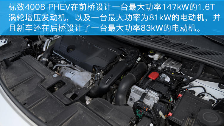 动力部分,标致4008 PHEV在前桥设计一台最大功率147kW的1.6T涡轮增压发动机,以及一台最大功率为81kW的电动机,并且新车还在后桥设计了一台最大功率83kW的电动机。这套混合动力系统综合最大功率为221kW,综合最大扭矩为520N·m,单从这套动力总成的账面数据以及标致此前公布的7.1秒的百公里加速时间来看,说这台车是一台高性能SUV确实一点不为过。
