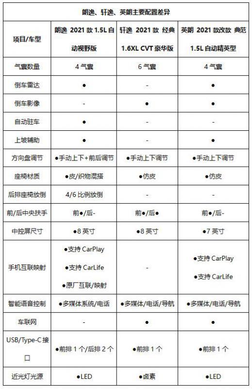公平起见,我们把三款备选车型一一列举出来,分别是朗逸 2021款1.5L自动视野版,轩逸 2021款 经典 1.6XL CVT豪华版,英朗 2021款改款 典范 1.5L自动精英型。下面,我们就以此三款车型为例,进行详细盘点。