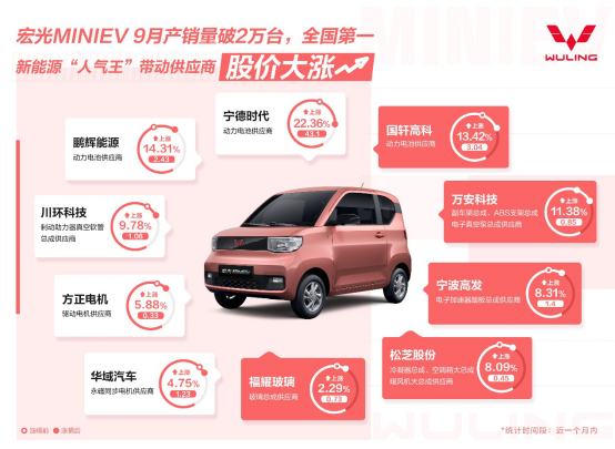 这款“人民的代步车”销量节节攀升,热销势不可挡,凭借着自身硬核的“带货实力”,带动宁德时代、国轩高科、鹏辉能源等供应商配套出货量及销售业绩提升,也正因此,资本市场上,宏光MINIEV供应链股票估值被看好,被财通证券、同花顺财经等多家券商、财经类媒体大力推荐且股价持续上涨,大有形成“宏光MINIEV”概念股的趋势。