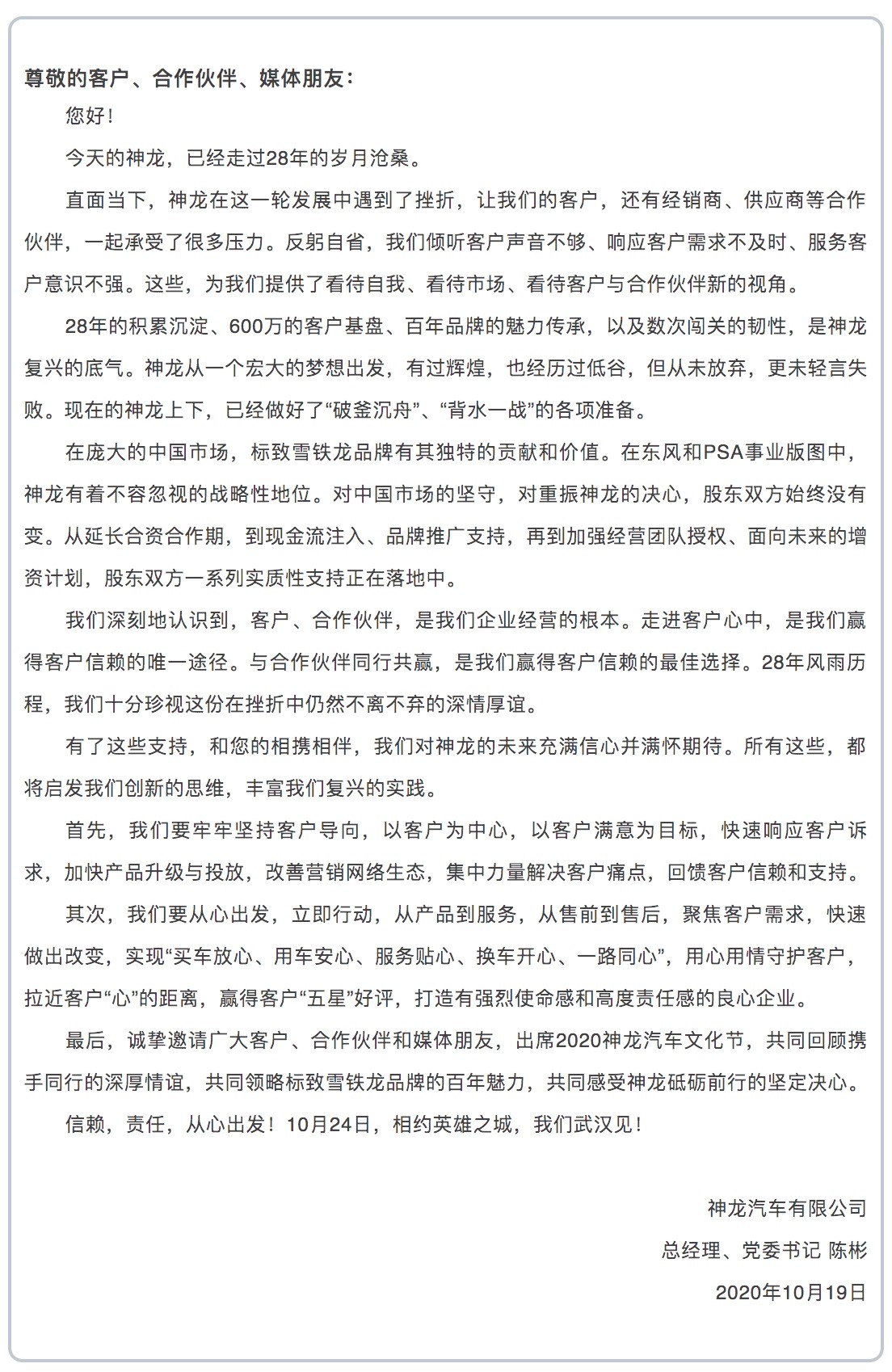 一个细节是,官方消息称“9月18日已经提前超额完成车展既定销售目标。”次日即10月19日,履新不久的东风汽车集团股份有限公司总裁助理、神龙汽车有限公司总经理、党委书记陈彬也首度对外发出的一封公开信。