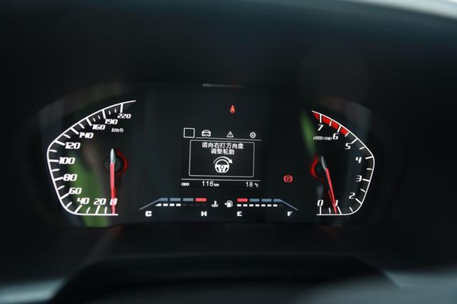 仪表盘左右两侧分别是转速表和时速表都是实体指针设计,中间行车电脑采用单彩显示屏,可以显示基本车辆信息以及水温和油量。当你的方向盘没有回正的时候行车电脑会提醒你方向盘像那边打回正,设计很贴心。