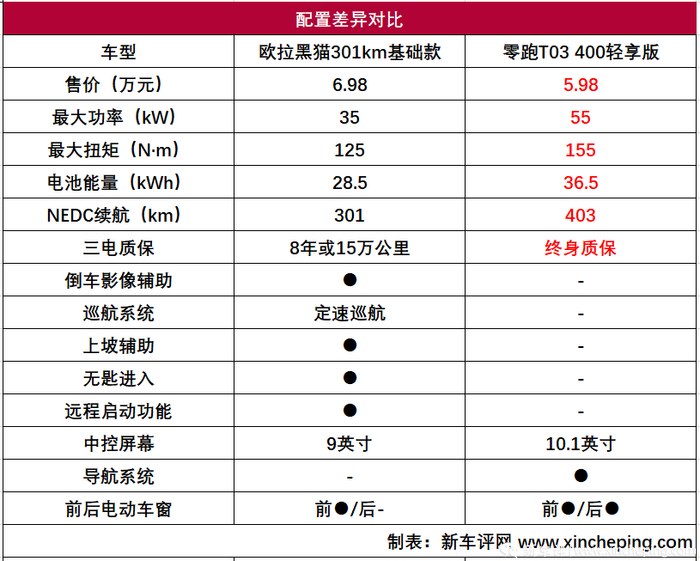 6.98万元只能买到欧拉黑猫301公里续航车型,电充容量为28.5kWh,而5.98万元能买到零跑T03 轻享版,电池容量为36.5kWh。零跑T03的电池为宁德时代,而欧拉黑猫的电池供应商是自家蜂巢能源,假设两者品质、单位电池容量成本一样,零跑T03光电池这一块,成本就要比欧拉黑猫多28%左右。