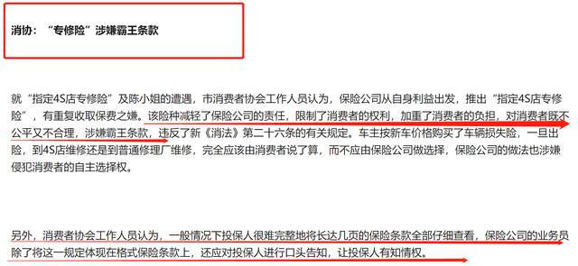 值得一提的是,法律专家和消费者协会也针对:因为消费者没有购买"指定专修险"而导致保险公司拒赔进行了合理的解释。消费者协会曾指出:专修险涉嫌霸王条款。