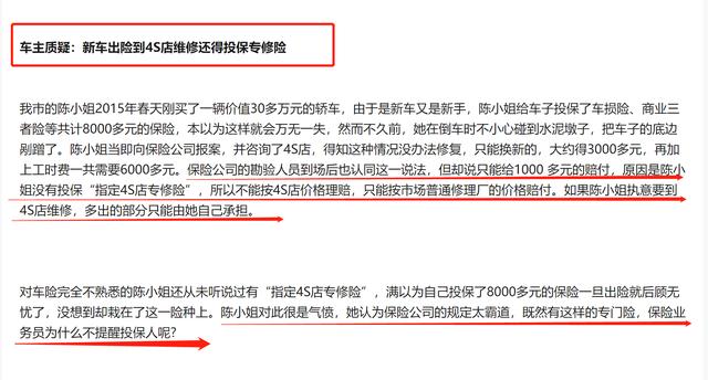 另外,因为车主没有买"指定专修险",而保险公司拒绝赔付的案例也是数不胜数,而它们之中的大多数人都存在过被保险公司专员和4S店工作人诱导的事情。