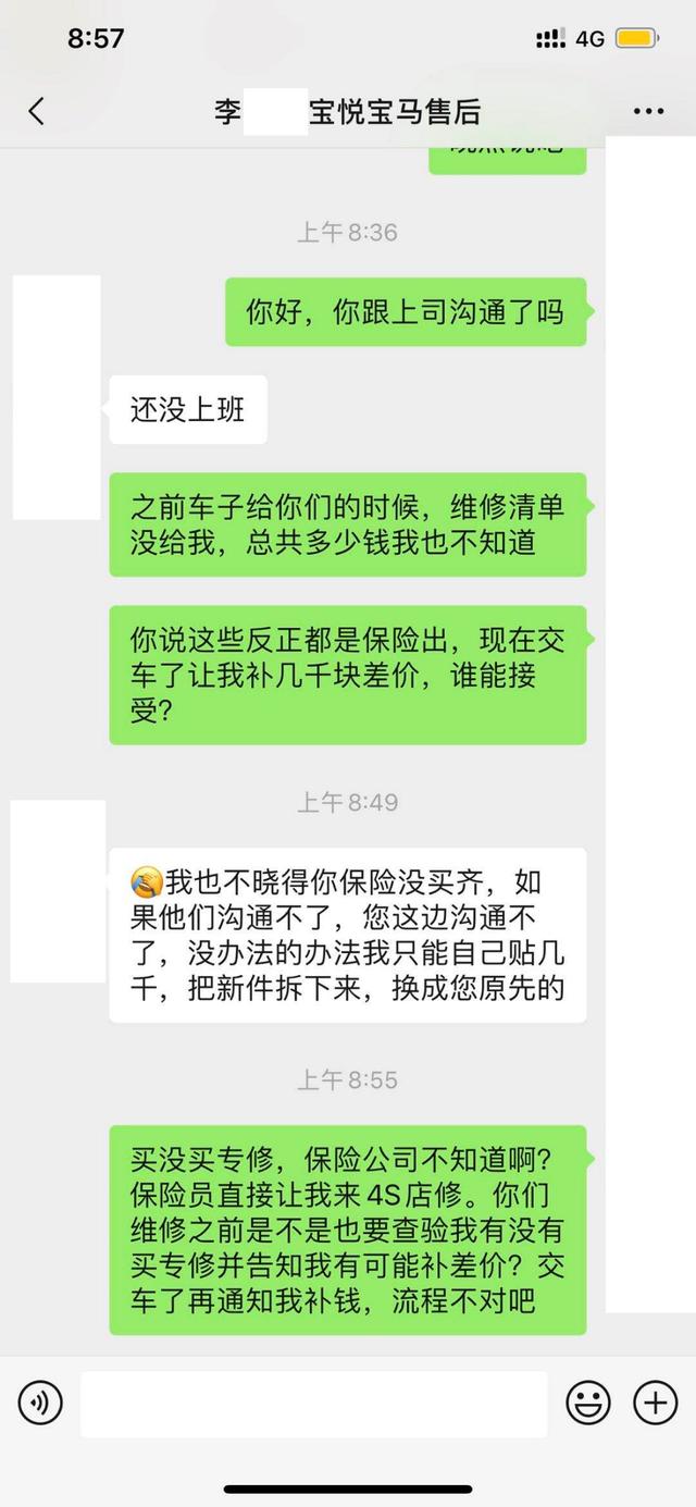 其次,曾先生去长沙宝悦宝马4S店进行定损维修时,4S店的维修顾问也没有事先告诉曾先生的宝马530Le并没有买"指定专修险"和存在需要补差价的事情。他们反而是在车辆修理完成后才"马后炮",强迫曾先生补差价。正常情况是宝马4S店可以拿到第一手信息,为什么它不第一时间告诉车主曾先生呢?长沙宝悦宝马4S店错在其二。