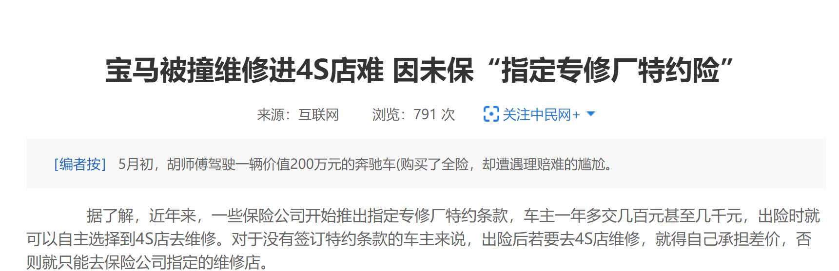 首先,曾先生按正常程序理赔报案,因此在报案之后,保险公司有义务告诉曾先生有没有买这个险(指定专修险)。显然,平安保险没有走正常的流程,他不仅没有事先告知曾先生的车没有买"指定专修险",还直接让曾先生去长沙宝悦宝马4S店进行维修。这种带有"强迫"意思的误导性指定,让人细思极恐。保险公司错在其一。