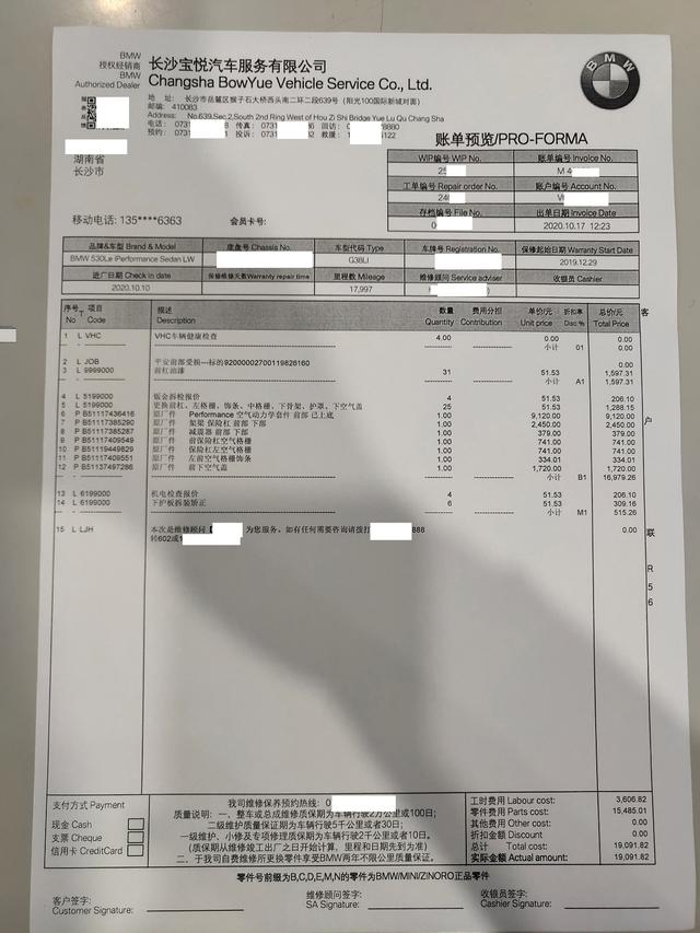 长沙宝悦宝马4S店维修顾问发给曾先生一份维修清单,清单上显示:宝马530Le此次定损维修累计花费1万9千余元。虽然价格正常,但是事情还没完。长沙宝悦宝马4S店以宝马530Le没买全险为由要求曾先生再掏7000多元的维修费,保险公司定损价格和4S店维修价格的差价。至于那个没买的"全险"则是——"指定专修险"。