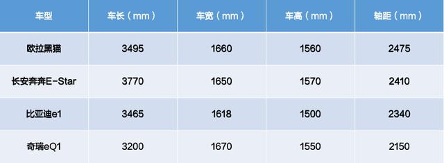 欧拉黑猫的三围分别是3,495/1,660/1,560mm,是典型的A00级的标准尺寸,但是轴距达到2,475mm,这样的轴距尺寸超过了它的所有竞品,明显好处就是尽量拓展了车内实际使用空间。