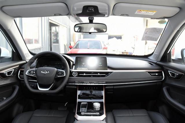新款瑞虎e的内饰也进行了重新设计,整体采用环抱式座舱设计,线条更为平直,细节处还加入了玫瑰金饰条进行装饰,一定程度上烘托出了不错的豪华感。