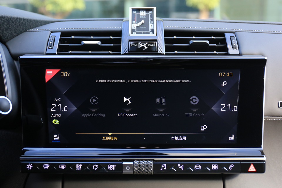 DS 7所搭载的12.3英寸中控屏周围保留有黑色边框,使中控屏在视觉上显得更加宽大。此外,中控屏支持导航、Carplay、CarLife等常用功能。