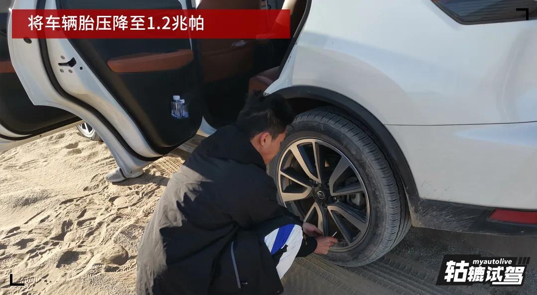 进入沙漠前,工作人员为全新奇骏的轮胎放气,将胎压降至1.2兆帕(mPa),从而加大轮胎与地面接触面积,降低沙漠中陷车的几率。