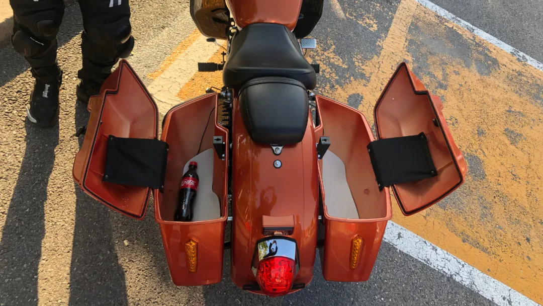 边箱容积不小,便于携带一般随身物品,但头盔没戏(哈雷范儿瓜皮盔除外)。这车有边支和中撑,边支没有熄火开关,中撑巨沉。建议增加后座扶手以及原厂配带靠背尾箱。