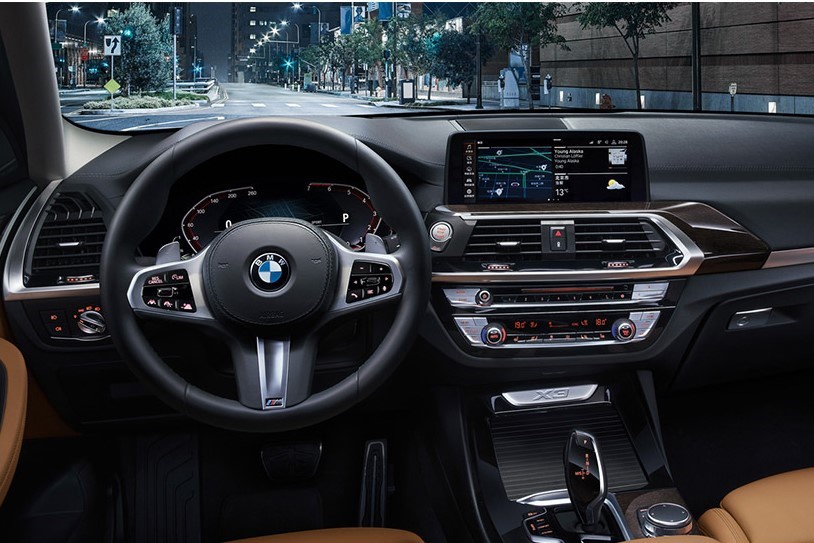 宝马X3的车内采用传统的T字形中控台布局,并略向驾驶员倾斜,体现了以驾驶员为中心的设计方向。车内还配备了12.3英寸全液晶仪表,以及10.25英寸中控屏,并采用第7代iDrive系统,支持导航手机互联等功能。