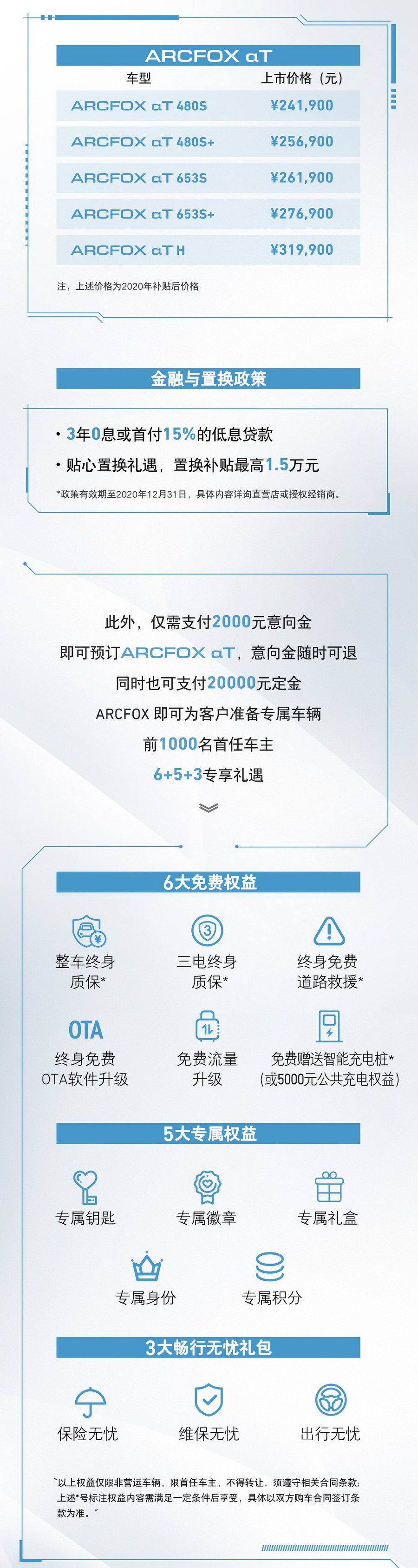 至今年底,购车用户可以享受3年0利息或首付15%的低息贷款,置换补贴最高1.5万元;另外前1000名首任车主可以享受6大免费权益,包括整车终身质保、三电终身质保、终身免费道路救援等。