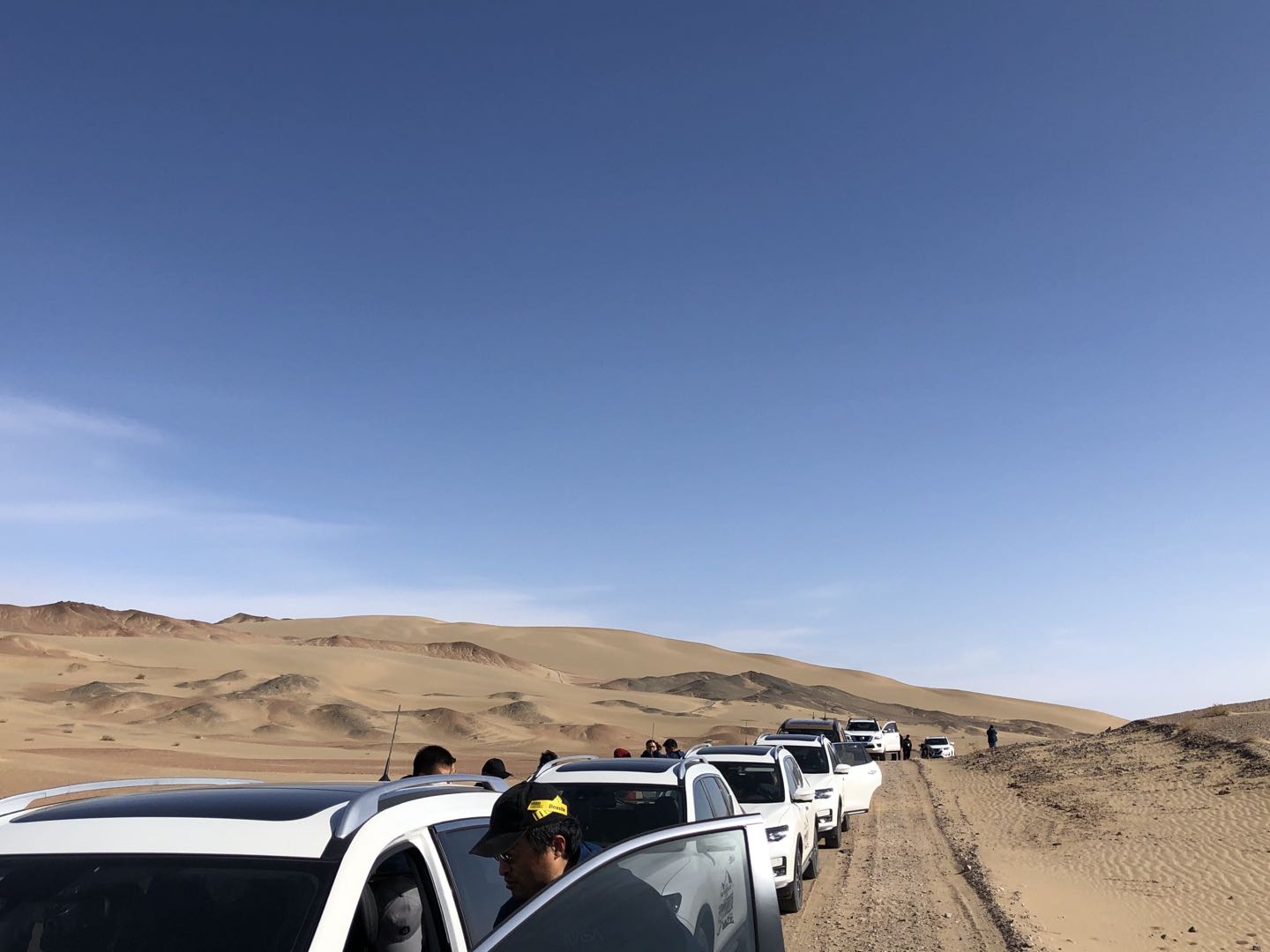 在戈壁中疾驰,远处金山连绵,反射着耀眼的光芒。在戈壁和沙漠的交界地带,我们停车修整,在助教的指导下插旗放胎压,将胎压降至1.2兆帕(mPa),加大轮胎与地面接触面积,降低沙漠中陷车的几率。