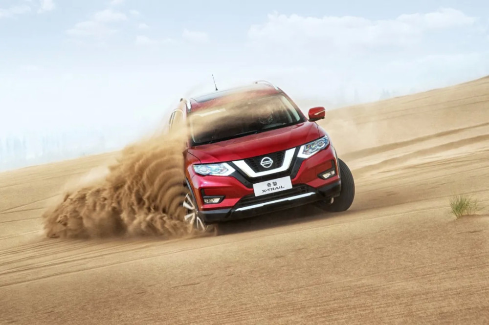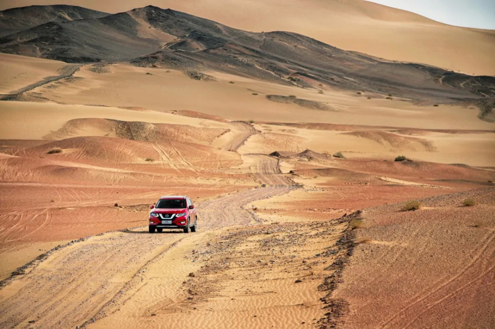 在一系列准备工作结束后,我们重新上车出发。面对更难的路段,这次我们将车辆切换成四驱Lock模式,激活B-LSD电子制动差速锁。松软的沙子对于车辆的行驶稳定性确实造成了不小的阻碍,即便如此在沙漠里开车也要保持一定的速度,毕竟有句说叫“紧走沙子慢走水”,另外在沙漠中行驶方向盘绝对不能打的太大,一个是胎压低转向太大容易脱胎,另一个是容易侧翻。不过只要稳住油门,遵循前车的车辙,对于奇骏来说平稳前进并非难事。