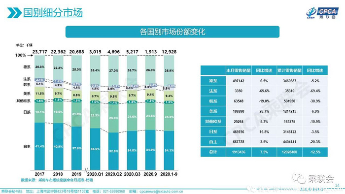 法系品牌积弱多时,高端法系品牌DS被转手宝能,至今毫无起色,雷诺乘用车也黯然退出中国市场,剩下华晨雷诺金杯苦苦挣扎。乘联会数据显示,2017年法系品牌市场占有率为2.1%;2018年占有率为1.4%;2019年占有率为0.7%;而今年1-9月,法系品牌更跌至0.3%,9月份零售销量只有3350辆。