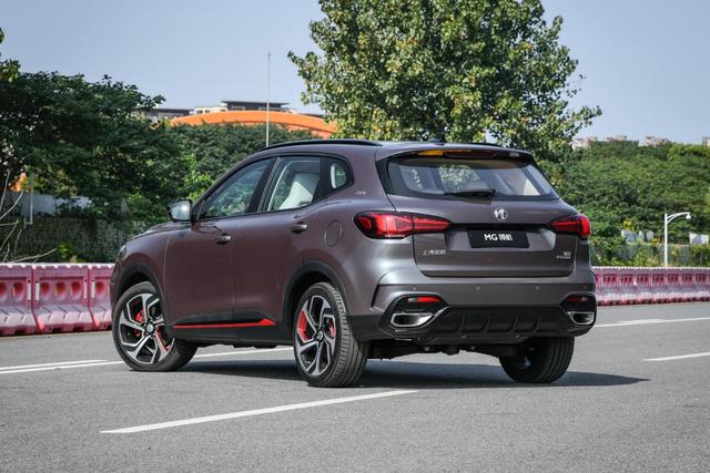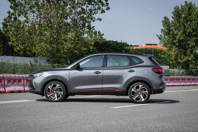 车身侧面延续了名爵HS简洁的设计风格,并没有太多隆起的线条,高配车型配备的19英寸双色的五辐轮毂造型动感,并配有红色卡钳,增强了整车外观的运动氛围。车身尺寸上,其长宽高分别为4610/1876/1685mm,轴距为2720mm。
