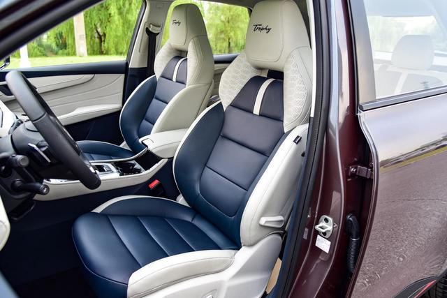 前排提供一体式真皮运动座椅,并且在特特版车型的头枕上还加入了Trophy标识,拥有不错的包裹性,肩部采用了打孔处理;中高配车型座椅具备6向电动调节和手动腰部支撑调节,为副驾驶座配备了4向电动调节,同时前排还带有加热功能。