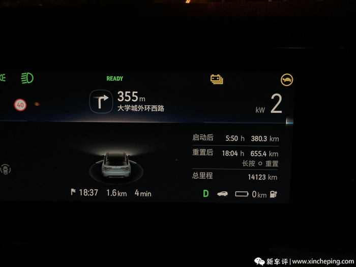 在续航里程低于50公里时,ES6的仪表屏幕上弹出电量低的提示,在续航里程已经不显示后,屏幕右上角提示小乌龟,但即便如此,整车空调和初段的加速性似乎并没有减弱,按照陈函老师的经验,在小乌龟出来以后还可以行驶5-10公里,此时NOMI已经开始提醒是否需要导航到充电站。