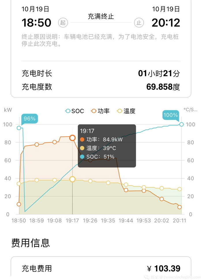 在耗尽了电量后,我们来到和往期相同的北亭特来电充电站,插上充电枪后,初期充电桩对于电池soc的识别有失误,不过这也无伤大雅,过了1分钟左右,充电功率就已经攀升到接近80kW时,大约20分钟后更是达到了84.9kW的最高充电功率,已经非常接近这里单个充电桩的90kW的峰值功率了。在电量超过50%后,充电功率降至60kW,超过80%时,功率再次断崖式下滑。