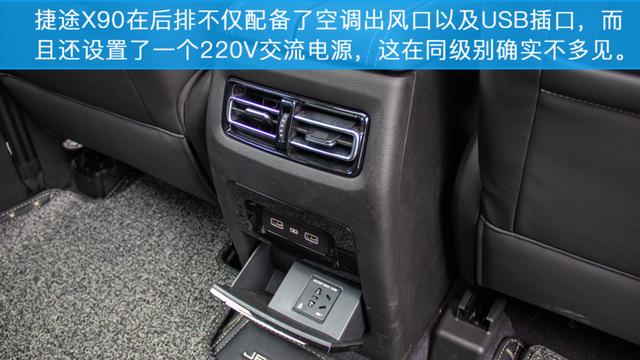 捷途X90同样考虑到了后排乘客的乘坐体验,不仅配备了空调出风口以及USB插口,而且还配备了一个220V的交流电源,这个配置在同级车型中确实不多见。220V电源对于一些经常在车上使用电脑或者是一些电器的消费者来说是非常实用的。