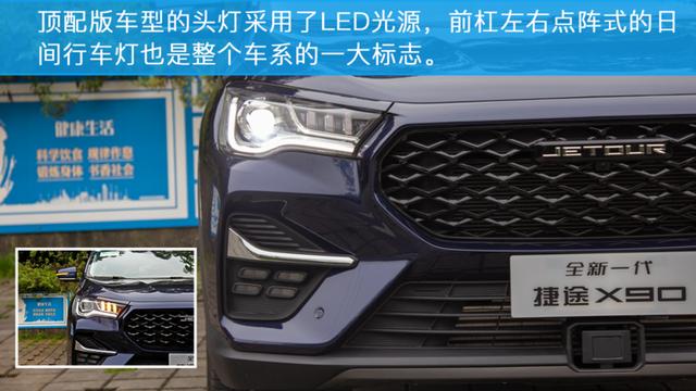在外观方面,与刚刚发布的捷途X70 PLUS (配置|询价)不同,捷途X90采用了沉稳、大气的外观设计,这非常符合它旗舰级车型的定位。车头部分看起来非常具有层次感,扁平的中网内部采用了黑色元素,整体看上去十分的精神。本次试驾的顶配版车型配备了LED头灯。前杠两侧的点阵式日间行车灯非常的具有特点,这也是整个车系的一大标志。