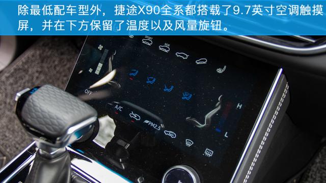 除最低配车型外,捷途X90在中控屏下方都设置了一块9. 7英寸的空调触控屏幕,并将座椅加热/通风、驾驶模式选择、电动尾门、陡坡缓降等功能的开关都设置在了屏幕上方。虽然在使用感受上仍然没有实体按键那么直观,但是确实不用来回翻中控屏了,并且还在一定程度上提升了车厢内的科技感。在下方还设置了两个旋钮,分别用来设置温度以及风量,不过在旋钮的质感上确实不敢恭维。