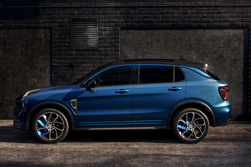 车身侧面,领克01全球版车型相较于现款车型的最大变化在于侧裙下方的镀铬线条,金属质感提升了整车的精致感,也起到装饰效果。此外,搭配着带有蓝色元素的五辐"花瓣"式轮圈,提升了整车的运动感。车身尺寸上,其长宽高分别为4549/1860/1689mm,轴距为2734mm,和现款车型相比在宽度上有所增加。