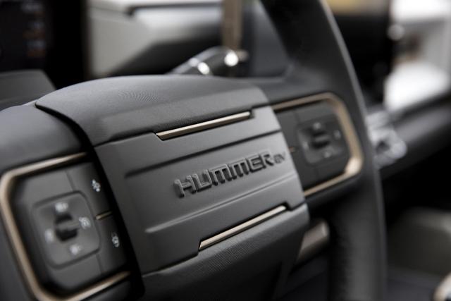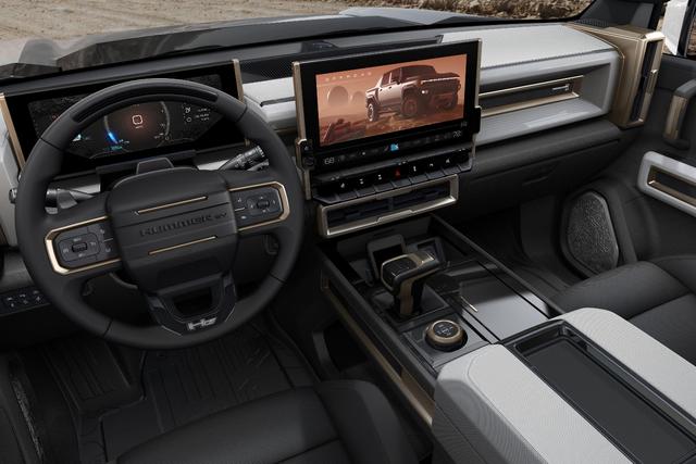 进入内饰,可以发现HUMMER EV依旧走的粗犷的设计路线,大量金色装饰为座舱带来不错的豪华感,新车配备了12.3英寸全液晶仪表以及13.4英寸多媒体显示屏,中控大屏可以显示丰富的越野相关信息,包括输出扭矩、差速器啮合、胎压、俯仰角和滚动角、车辆性能状态显示、摩擦圆及扭矩矢量等。可以说整个内饰颠覆了传统皮卡那种粗狂的设计,带来的是科技感十足现代化感受。