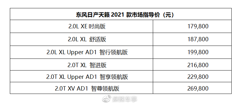 2020年10月30日,东风日产天籁 (配置|询价)2021款焕新上市,共推出6款车型,市场指导价为17.98-26.98万元。