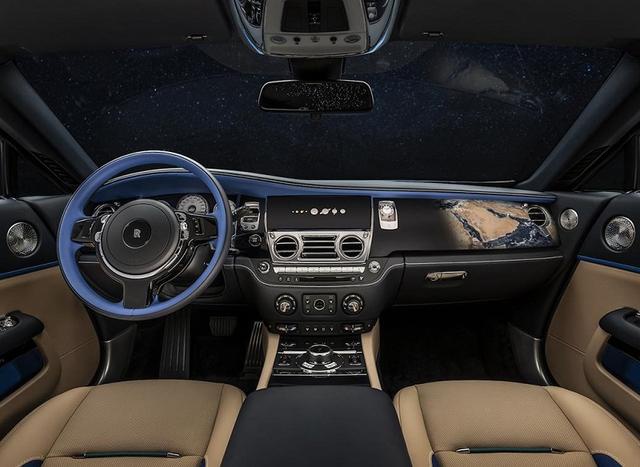 内饰部分,劳斯莱斯魅影Inspired By Earth特别版的设计灵感同样来自于大自然。内饰当中的蓝色与棕色的搭配设计,也代表了地球上陆地和海洋的颜色。同时,新车中控饰板上也印上了太阳系八大行星的图案,此外副驾驶面板处同样印上了整个阿拉伯半岛地区的卫星云图,新车的这些设计理念着实丰富和独特。