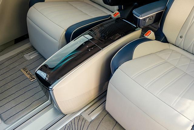另外,车辆配备了名为“魔吧”的可移动中央扶手箱,前方的储物格带有制冷及加热功能,后方的储物格则可放置茶具,魔吧可通过触摸按键进行前后移动。